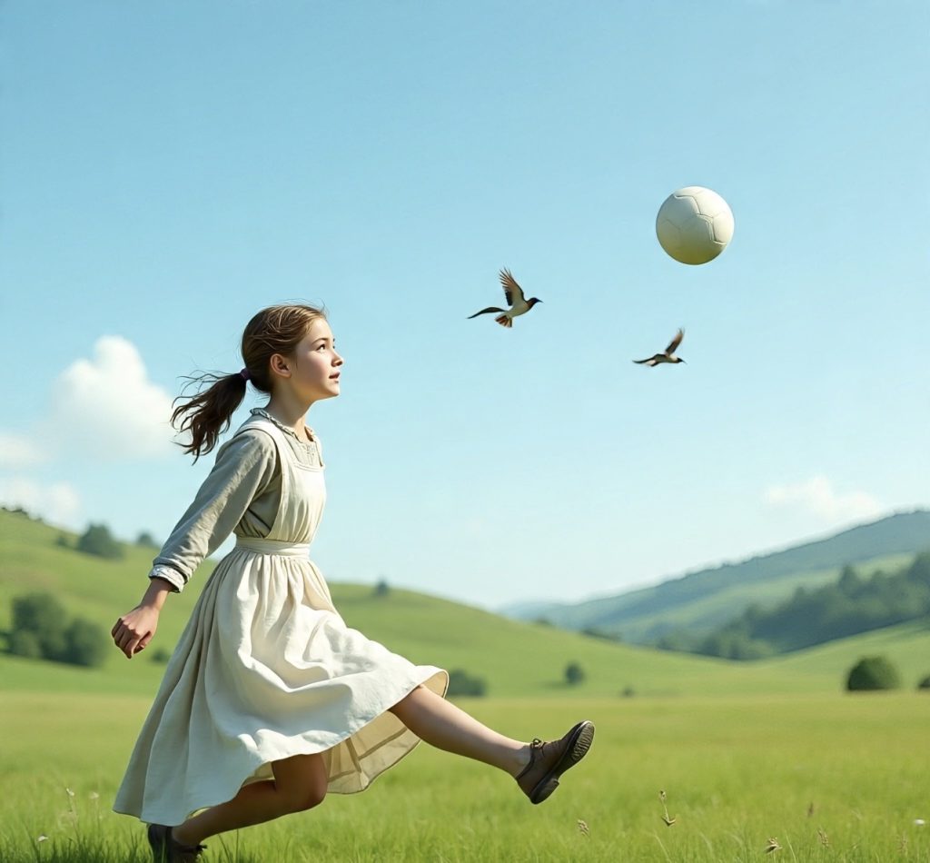 A adolescente respirou fundo, tomou uma certa distância, pediu apoio à ancestral das focas, correu para a pelota e chutou forte.