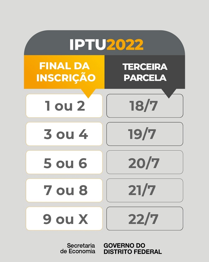 Começou nesta segunda-feira (18) o prazo para pagamento da terceira parcela do Imposto Predial Territorial Urbano (IPTU) 2022 e da Taxa de Limpeza Pública (TLP). Em 2022, o imposto é cobrado em seis cotas, duas a mais do que em 2021. O Governo do Distrito Federal (GDF) já arrecadou mais de R$ 1 bilhão com o IPTU neste ano, exatamente R$ 1.008.437.697,67. Já com a TLP, foram arrecadados R$ 132 milhões.