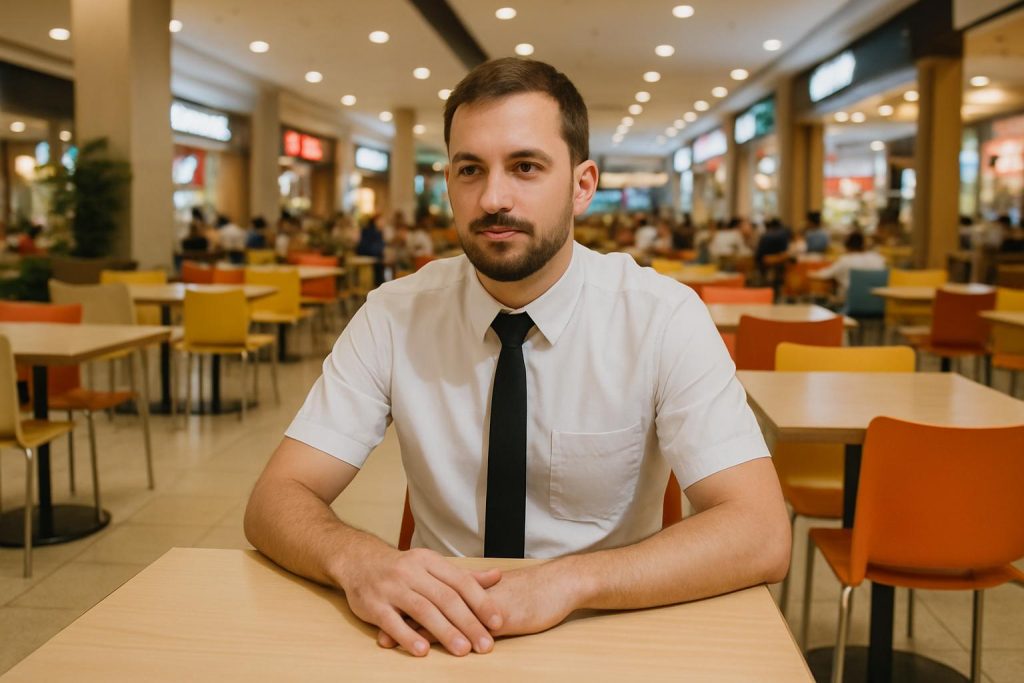 Durante a hora do almoço, o homem gostava de ficar acomodado em uma das inúmeras mesas da praça de alimentação. Antes de dar a primeira abocanhada, dava aquela olhada ao redor, como se estivesse avaliando os frequentadores. Aquela magrela, certamente, nem desconfia que o marido está de olho naquela de vestido colado. Ih, olha o jeito daquele ali. Até parece que ninguém sabe que está usando peruca. O que aquelas duas garotas estão pensando? Ah, já sei, estão apostando para ver qual irá ficar com o rapaz de jaqueta jeans.