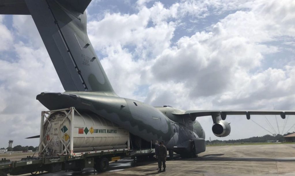 Por via marítima/fluvial, o oxigênio é levado de navio para portos mais próximos, no caso é Belém (PA), onde o produto é envasado e embarcado em balsa para fazer o trajeto fluvial até Manaus. O carregamento de 90 mil metros cúbicos da operação realizada esta semana pela Marinha está sendo aguardado para chegada na capital do Amazonas nos próximos dias.