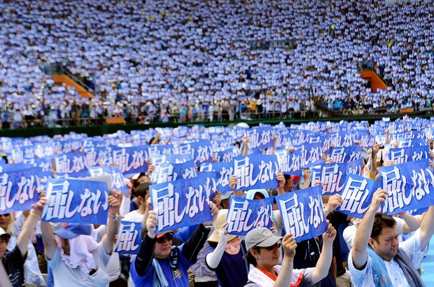 “O governo (central) nos acusa de um bloqueio que já dura 19 anos e nos pede para encontrarmos outro lugar (para realocar a base). É escandaloso”, disse à multidão Susumu Inamine, prefeito de Nago, cidade vizinha da futura base americana.
