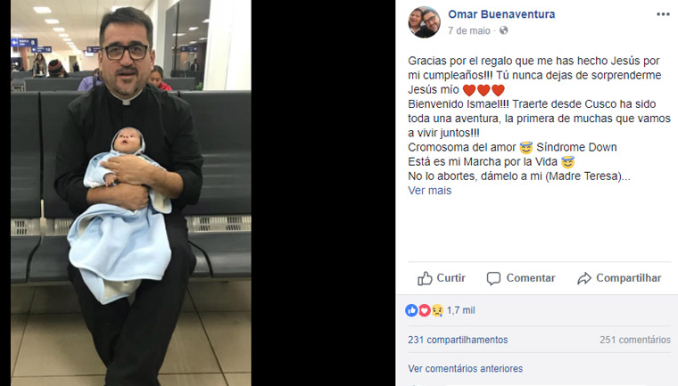 “Obrigado pelo presente que Jesus me deu no meu aniversário! Você nunca deixa de me surpreender, Jesus. Bem-vindo Ismael! Foi uma aventura trazer você de Cusco, a primeira de muitas que vamos viver juntos. Cromossomo de amor, síndrome de Down”, escreveu o padre na sua conta no Facebook.