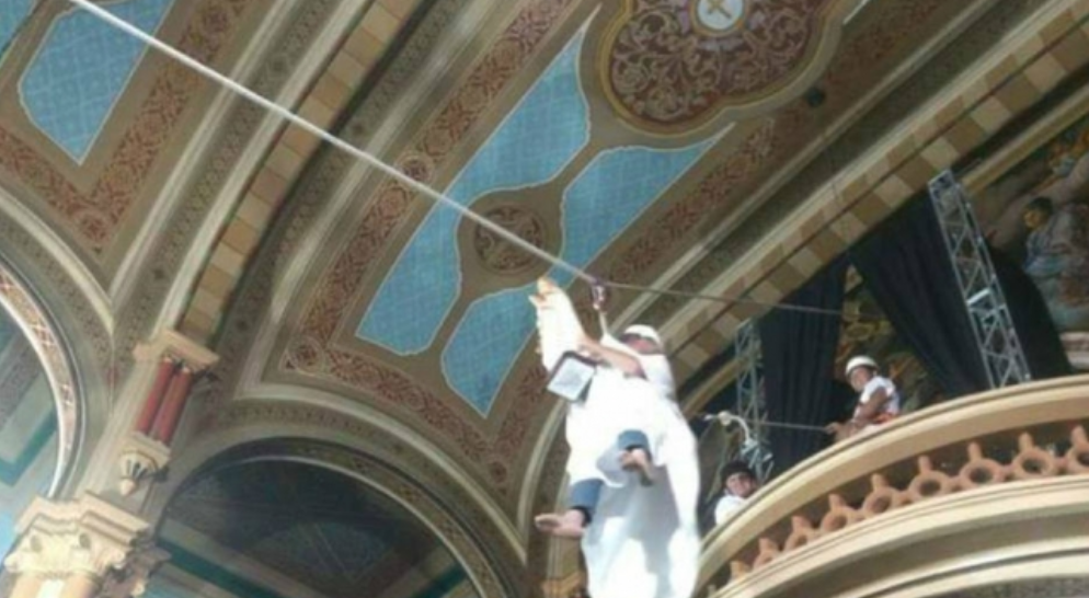 Era 13 de novembro, dia da Rosa Mística, quando religiosos foram surpreeendidos pela entrada inusitada do padre que celebraria a missa: desclaço, ele “desceu” ao altar a partir de uma tirolesa.