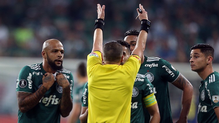 O Palmeiras entrou em campo exibindo uma sequência de nove jogos seguidos sem tomar gol, uma invencibilidade na Libertadores e ainda atuava dentro de casa. Ou seja, era uma lista imensa de ingredientes favoráveis. Pois logo cedo todo esse cenário desmoronou em um só lance. Aos três minutos, o volante Felipe Melo foi fazer um passe e deixou a perna em Victor Cáceres. O árbitro argentino primeiramente deu cartão amarelo, para logo depois mudar de ideia e expulsar o jogador.
