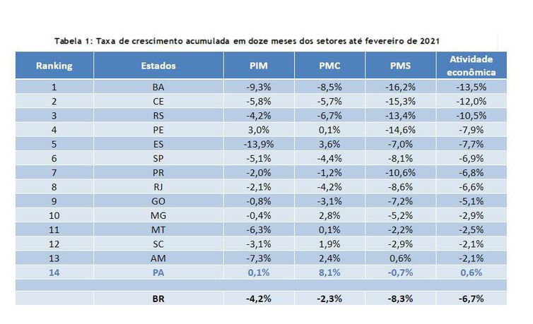 O estudo traça ainda um ranking de desempenho da atividade econômica, levando em consideração o peso de cada setor no respectivo PIB de cada estado. A percepção é que os estados com maior peso do setor de serviços no PIB tiveram a maior queda em sua atividade econômica nos doze meses avaliados. É o caso da Bahia (-13,5%) e do Ceará (-12%). No sentido inverso, o único estado com aumento da atividade foi o Pará (+0,6%).