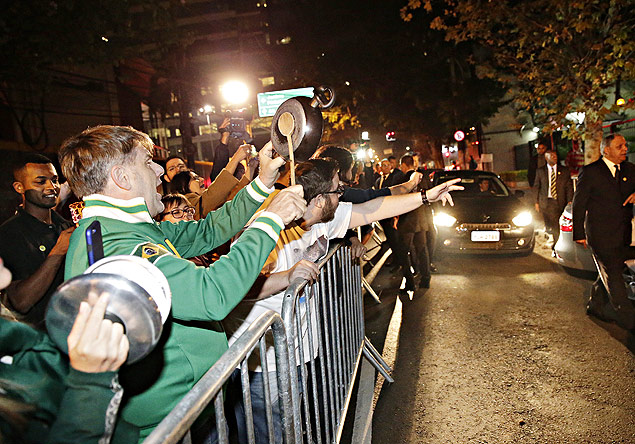 Cerca de 20 pessoas, algumas delas batendo panelas, gritam frases como “Fora, PT”, e “Lula cachaceiro, devolve meu dinheiro” e pedindo o impeachment da presidente. Alguns moradores das proximidades também bateram panelas nas varandas de seus apartamentos.