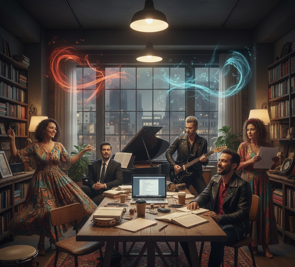 Porque ser humano é saber a perspectiva de futuro como possibilidade, antecipo trecho do paratexto inicial de Rapsódia da Rua da Mooca, em que Eduardo Martínez – um dos autores do livro – relaciona ritmos musicais com estilos de escrita. Eduardo nunca havia ouvido falar de escrita conjunta. Se bem que era de seu conhecimento que havia gente que escrevia letra de música em parceria. Mas nunca imaginara uma história escrita a tantas mãos. Mesmo assim aceitou o desafio, que, a princípio, causou dúvidas. Afinal, quem é que decide a trama, o desenlace? Imaginou que seria algo como uma orquestra, só que cada um tocando um ritmo diferente: “olha lá a Edna no frevo, o Gilberto no tango, a Marlene no rock, a Rosilene atacando de baião, e ele, Eduardo, tentando puxar para o lado do samba.”