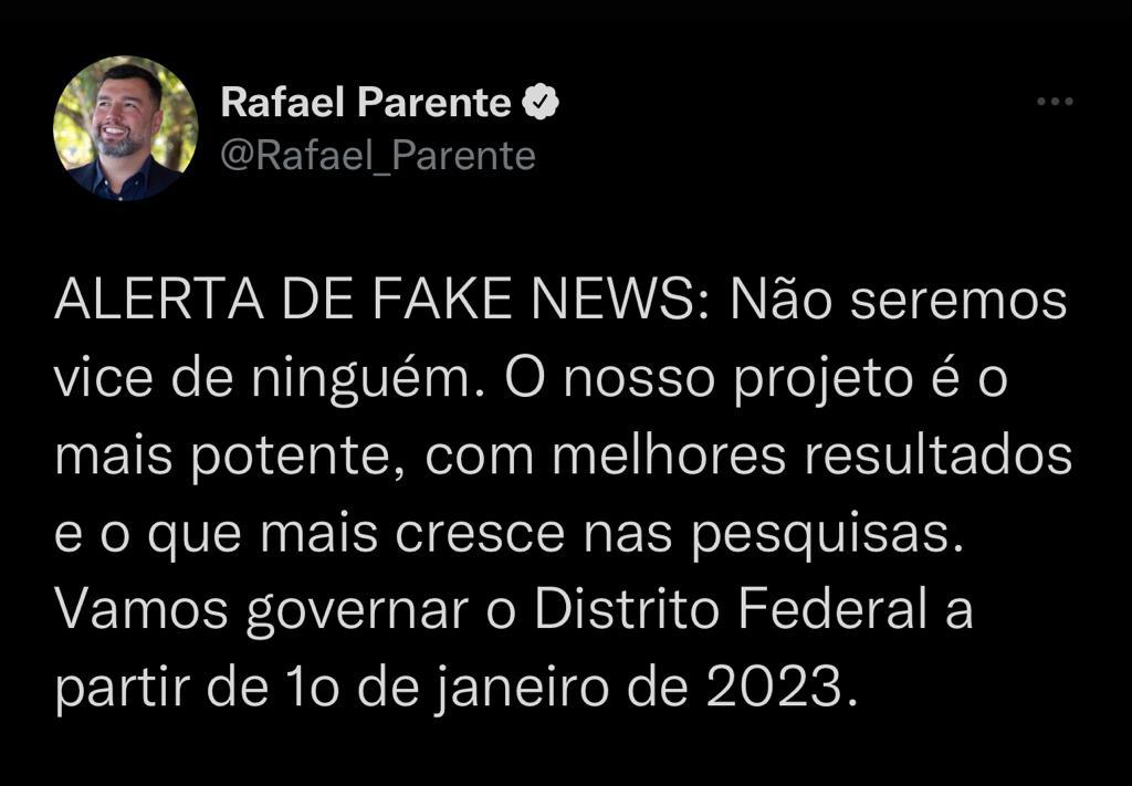 Rafael Parente usou uma fake para dizer que é fake a candidatura dele a vice, numa aliança PV-PSB-PT. As cúpulas dos partidos – inclusive o dele – não gostaram da reação mesquinha, típica de quem busca atingir apenas interesses pessoais. A situação fiou tão feia, que o ex-secretário de Educação de Ibaneis, defensor intransigente das escolas cívico-militares, foi desconvidado a compor a chapa majoritária. Resta-lhe agora tentar uma vaga de deputado distrital ou transferir seu título para Goiânia, onde ficaria em condições de concorrer a uma vereança em 2024. Sobre a pesquisa onde diz estar bem na fita, o Rafael é outro. Vem a ser o prudente presidente da Câmara Legislativa, que galga, com cuidado, os degraus que podem levá-lo à Câmara dos Deputados. Nesse imbróglio, e para manter a coligação em nome da vitória, Rollemberg está prestes a entrar no circuito. A tendência é a de que seja ele o nome para o Senado, jogando Rosilene para ser a segunda de Grass. E isso não é fake.