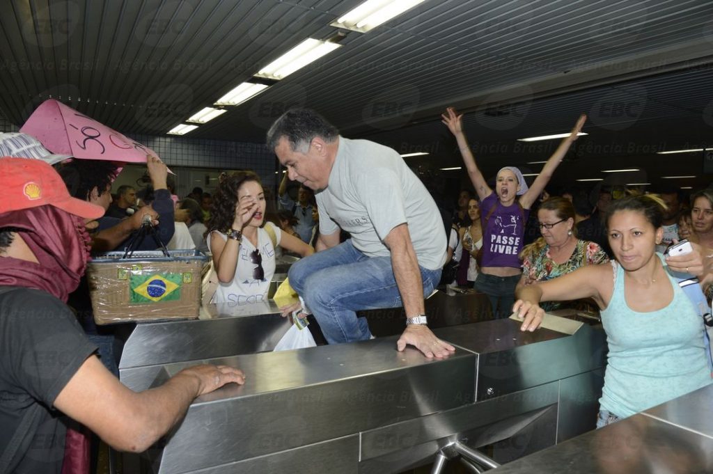 Os integrantes do movimento pularam as catracas do metrô e incentivaram quem por ali passava a fazer o mesmo. Os funcionários do metrô e a polícia não tentaram conter o “catracaço”, que durou aproximadamente dez minutos. No fundo, é mais uma dor de cabeça para o conturbado governo de Agnelo Queiroz administrar.
