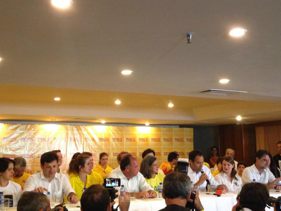 Há sete meses, o ex-governador Eduardo Campos (PSB) lançava o nome do afilhado Paulo Câmara para a sucessão ao Governo de Pernambuco durante um ato político em um hotel na Zona Sul do Recife. Neste domingo (5), o ex-secretário da Fazenda volta ao mesmo local para fazer o primeiro pronunciamento como governador eleito. Paulo concede a primeira coletiva na mesma sala em que fez o primeiro discurso político, mas desta vez sem a presença do ex governador, que faleceu em um trágico acidente aéreo em agosto.