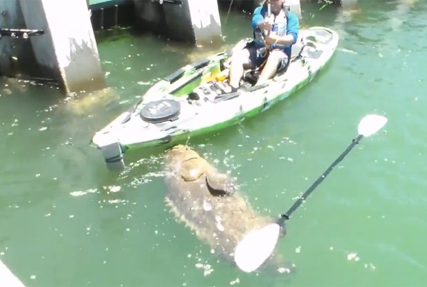 De caiaque, o pescador americano Jon Black fisgou um peixe enorme durante uma pescaria em Sanibel, no estado da Flórida (EUA).