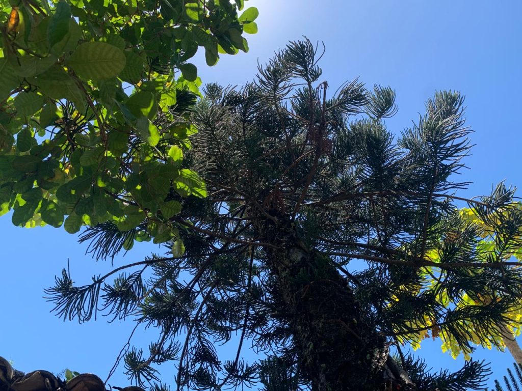 O elemento surpresa é um pinheiro solitário dentro da sua espécie, erguendo-se altivo entre os coqueiros que adornam os jardins de uma residência de veraneio na orla. Seu tronco robusto se eleva, desafiando coqueiros centenários à sua volta. Como escudo, árvores silvestres, floridas. Era como se a natureza tivesse decidido brincar com as expectativas, introduzindo um toque inesperado em meio à paisagem tropical.