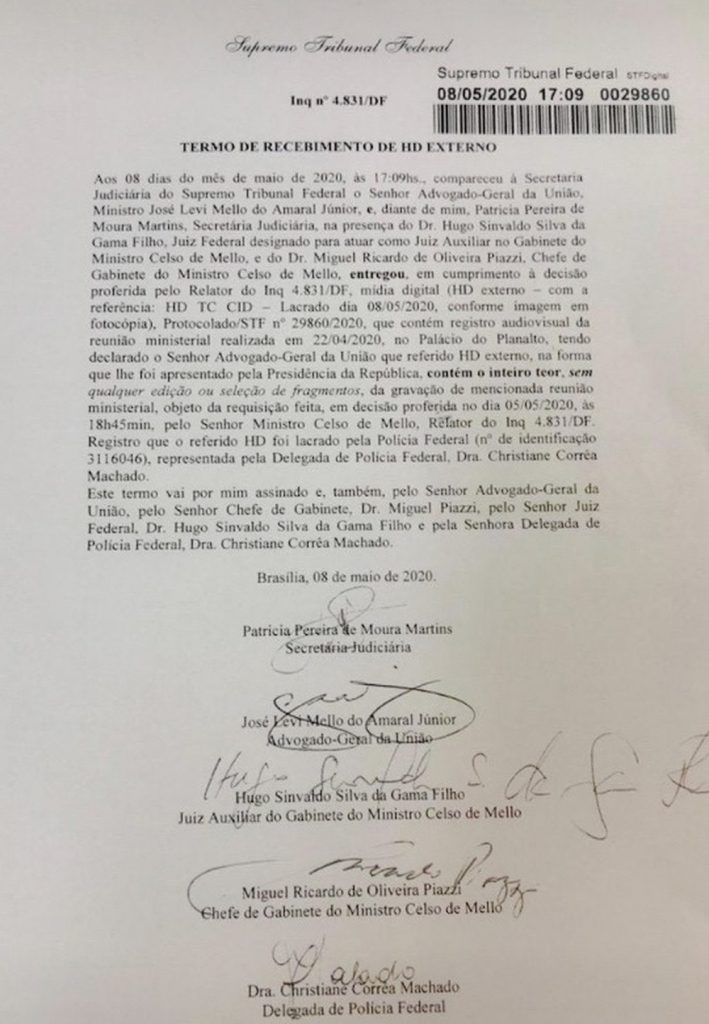 No despacho proferido na terça-feira (5), Celso de Mello pediu a cópia da gravação à Secretaria-Geral e à Secretaria de Comunicação da Presidência da República ao atender o pedido de diligência feito pela Procuradoria-Geral da República (PGR) no inquérito que apura as declarações do ex-ministro da Justiça e Segurança Pública, Sergio Moro, sobre suposta interferência de Bolsonaro na Polícia Federal (PF). A reunião foi citada por Moro em depoimento à PF na semana passada.