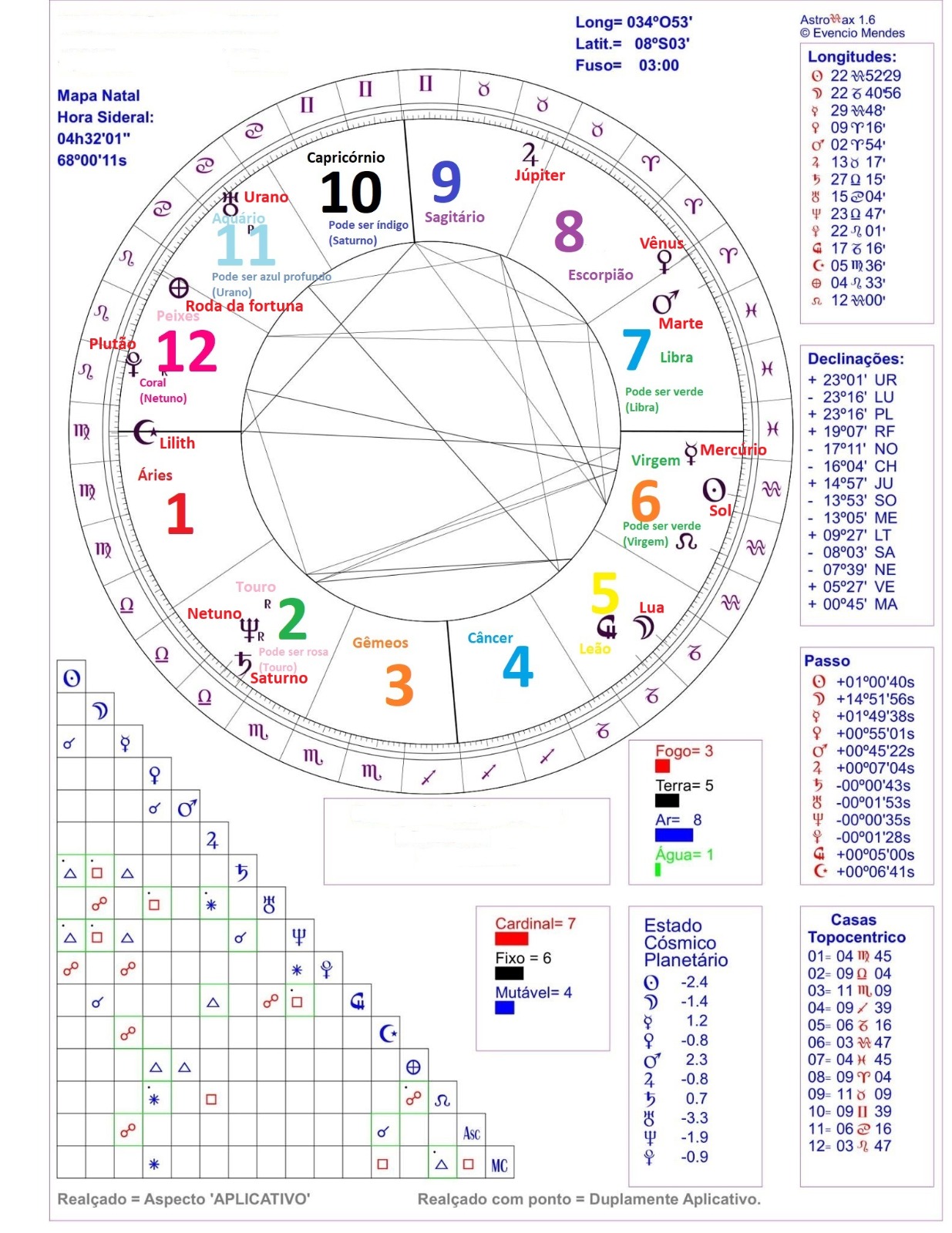 Para fechar, temos a “Roda da Fortuna”, calculada, e que indica em qual Casa, no Mapa Astrológico, se pode esperar mais sorte; e Lilith, ou Lua Negra, que mostra onde nos sentimos bem. Se Lilith está na primeira Casa, é de se esperar uma pessoa sensual, de bem consigo mesma.