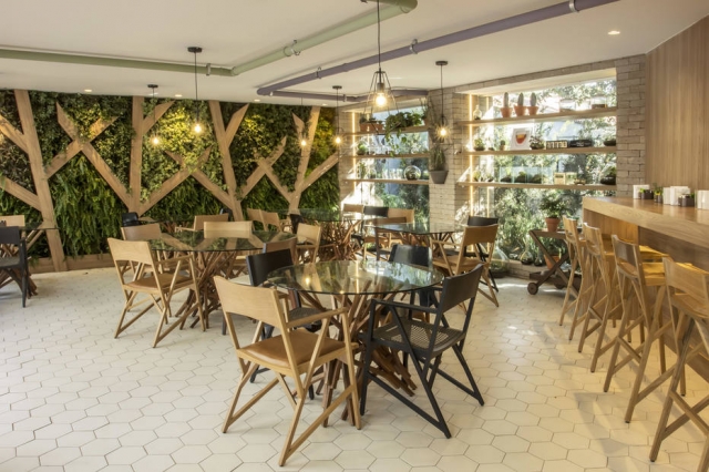 O destaque da obra, que durou dois meses, foi a instalação de um grande painel de madeira, que imita as ramificações de uma árvore e cria um jardim vertical com diferentes espécies. “Isso chama a atenção do visitante logo de cara”, acredita Steffi. Como a planta do espaço era retangular, as arquitetas optaram construir o local de entrada na diagonal, cruzando com o ponto de saída, o que ‘força’ os visitantes a descobrirem o que há no ambiente.