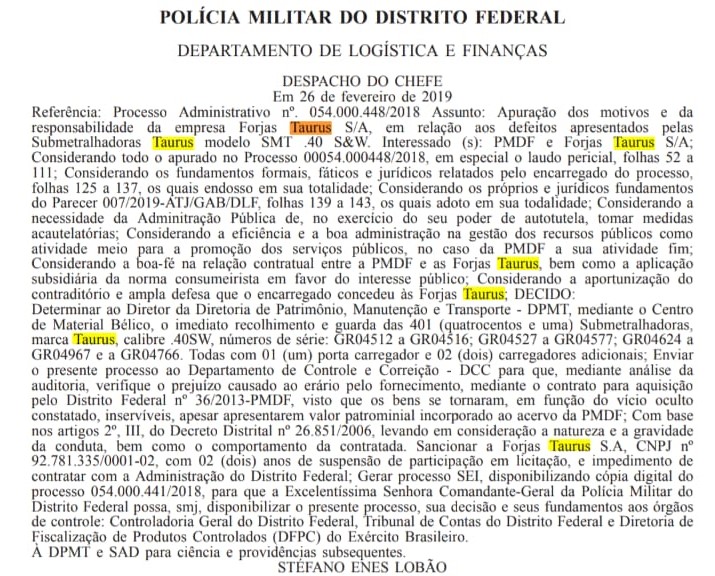 A Polícia Militar do Distrito Federal recolheu 401 submetralhadoras defeituosas fornecidas pela Taurus. A fabricante de armas também est´proibida, por dois anos, de participar de licitações no âmbito da administração pública de Brasília. Depois que calcular os prejuízos, a PM vai cobrar a conta da Taurus.