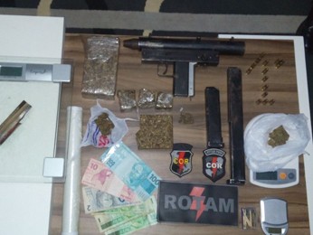Dois homens foram detidos na madrugada desta quarta-feira (24) com porções de droga e uma submetralhadora 9 mm, além de R$ 115. A abordagem ocorreu em Santa Maria.