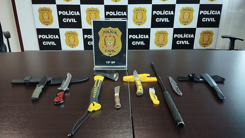 Durante a diligência, além do machado utilizado no crime, foram apreendidas 03 facas, 03 canivetes e 01 bastão retrátil, todos de propriedade do investigado.