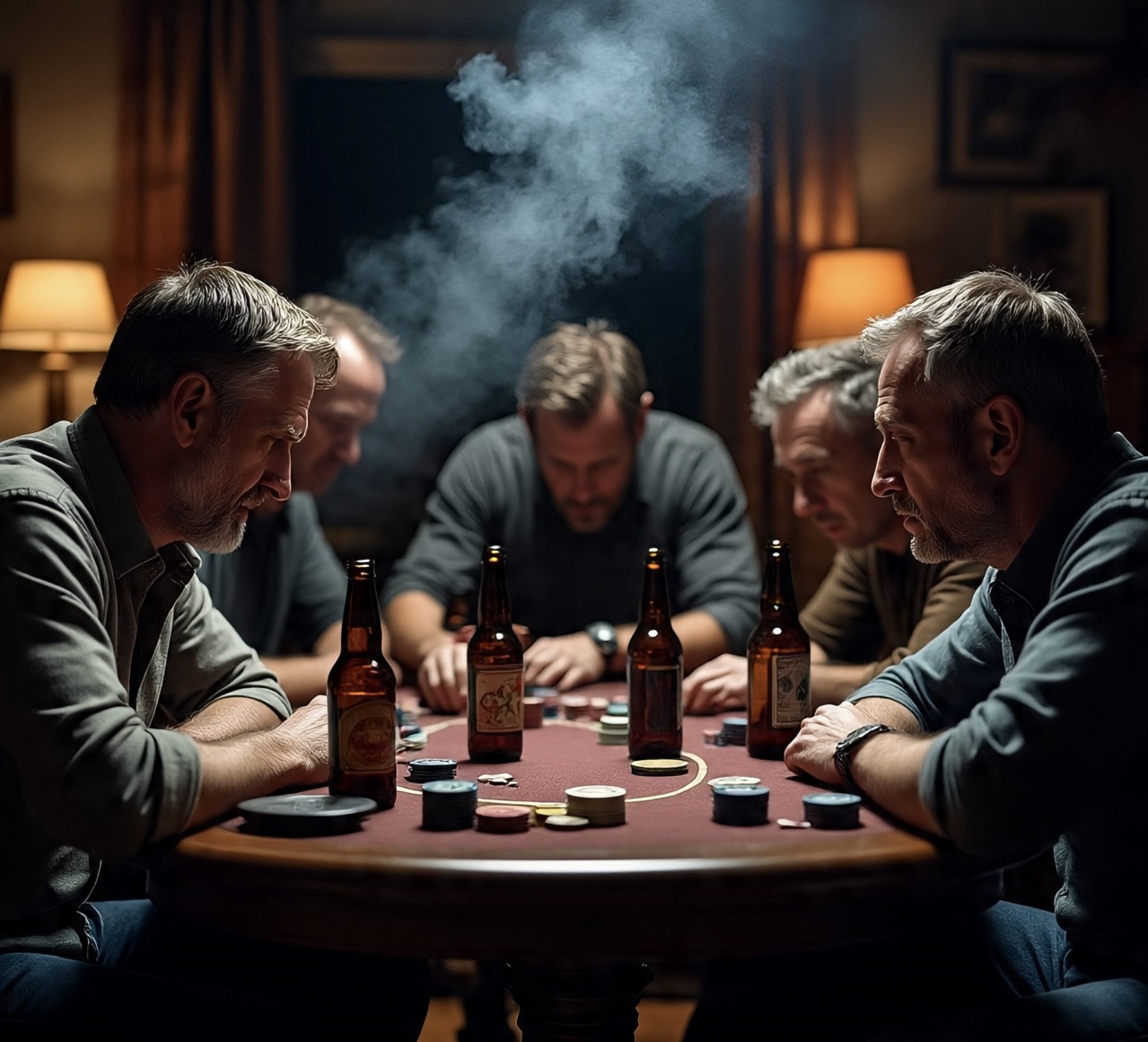 Como ocorria todos os fins de semana, estavam sentados há dez horas jogando aquele pôquer interminável. Uma densa nuvem de fumaça formatada por cigarros e charutos intermitentes pairava acima das cabeças, cinzeiros, fichas, canecas de cerveja, copos de uísque e pedaços adormecidos de pizzas.
