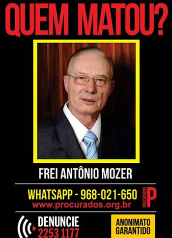 Os responsáveis pela morte do frei Antônio Mozer, de 75 anos, ainda não foram encontrados. Para tentar agilizar o trabalho da polícia, o Portal dos Procurados divulgou um cartaz com a foto dele e a mensagem: “Quem matou?”. O frei morreu numa tentativa de assalto, na manhã desta quarta, quando seguia de carro pela Rodovia Washington Luiz, na altura de Duque de Caxias. Os bandidos, que estavam de moto, fugiram sem levar nada.