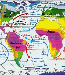 Como se sabe, correntes marítimas são rios de água salgada que têm temperaturas distintas e se deslocam em velocidades diferentes pelos oceanos do planeta, por conta de três fatores: o movimento de rotação da Terra, por influência dos ventos e da diferença de densidade entre a água dos oceanos, em função do grau de salinidade nas diferentes regiões.