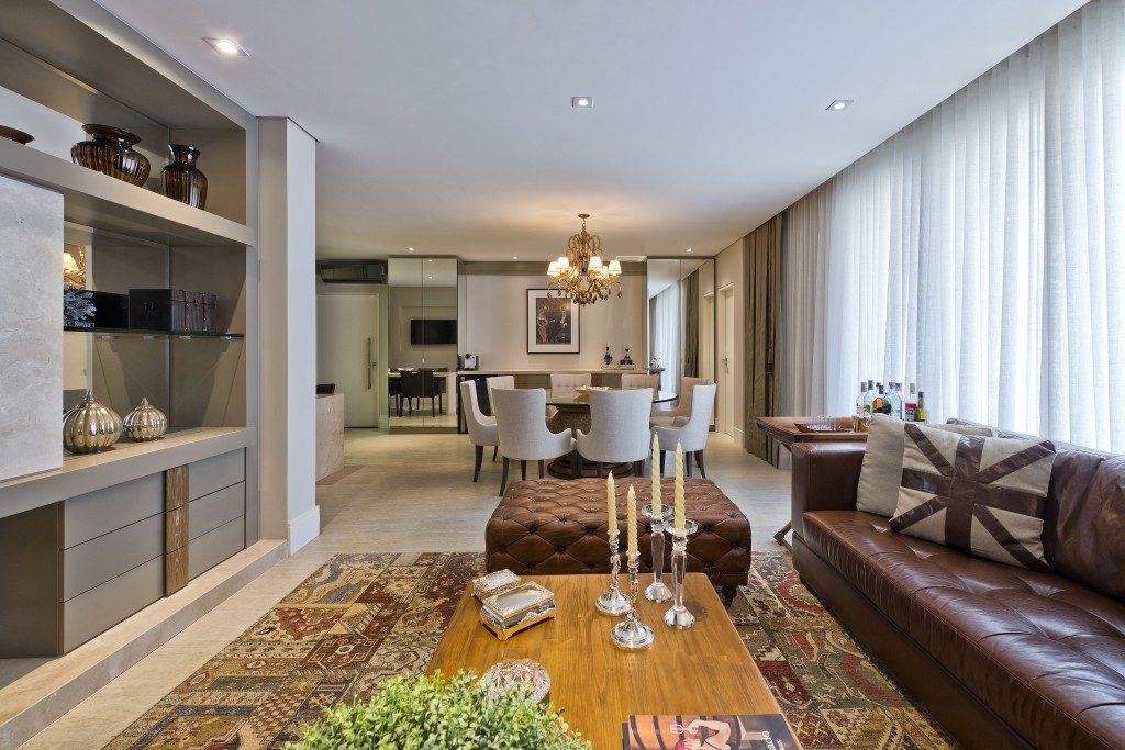 Na sala, o espelho acobreado rouba a cena, sendo que, além da função estética, sugere a sensação de espaço expandido. “A sala tem um formato meio ‘linguiça’ que vai da entrada à varanda. Por envolver inteiramente a parede, imprime profundidade e integra o ambiente. Tudo é válido para ampliar a percepção espacial”, explica a arquiteta. Para arrematar, tapetes, pufes e mesas de canto compõem o cenário, também simulando madeira.