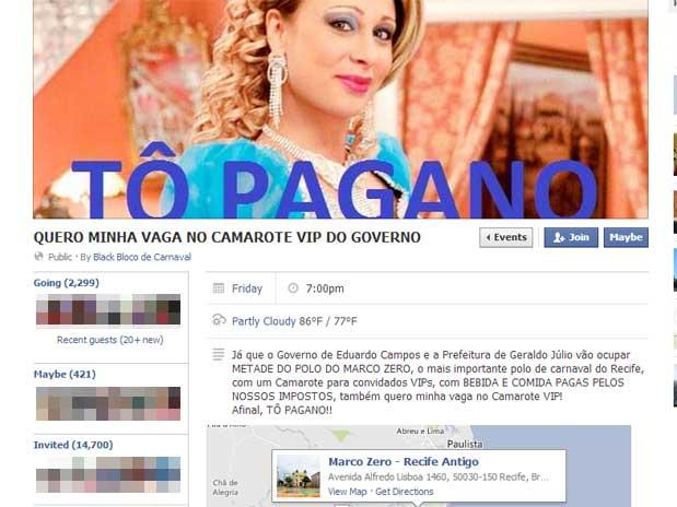 No Facebook, foi criado um evento chamado Quero Minha Vaga no Camarote Vip do Governo. Mais de 10 mil pessoas já haviam confirmado presença. Na descrição, os organizadores afirmam que querem suas vagas, visto que as comidas e as bebidas do evento são pagos com o imposto da população. O protesto está sendo organizado pelos grupos Direitos Urbanos e Frente Independente Popular de Pernambuco (FIP-PE).