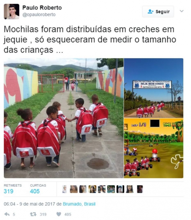 As mochilas distribuídas pela prefeitura de Jequié, cidade do Sudoeste da Bahia a 356 quilômetros de Salvador, estão virando alvo de piada nas redes sociais.