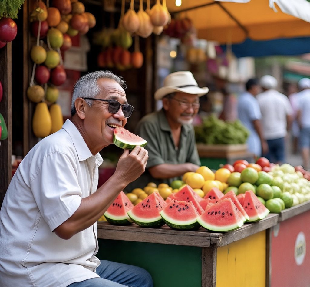 Assim que meus gastos sapatos voltaram à calçada, avistei novamente o camelô. Pelo número reduzido de fatias de melancia sobre a bancada, percebi que, provavelmente, se tratava de pujante comerciante local. E, por mero impulso, fui até ele.