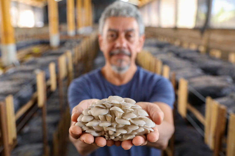 Para produzir os cogumelos, a propriedade abrange todas as etapas: compostagem, pasteurização, incubação e colheita. Com o apoio da Emater-DF, o produtor conquistou crédito rural, instalou painéis de energia fotovoltaica e aumentou em um terço a capacidade produtiva em 2024. E ainda há espaço para crescer: “Mesmo com o aumento, nossa produção ainda não consegue atender toda a demanda local”.