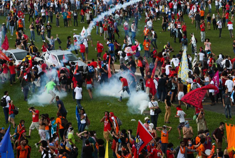 Para dispersar os manifestantes a Polícia Militar usou gás de pimenta e gás lacrimogêneo. Pressionado, o grupo recuou até a Catedral de Brasília, no Eixo Monumental, gritando palavras de ordem como “Fora Temer” e “Diretas Já”.
