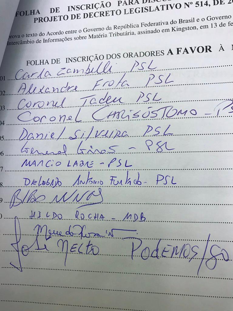 Na folha de inscrições desta terça, 26, cinco deputados do PSL aparecem em sequência, todos assinados com a mesma letra: Carla Zambelli, Alexandre Frota, Coronel Tadeu, Coronel Chrisóstomo e Daniel Silveira.