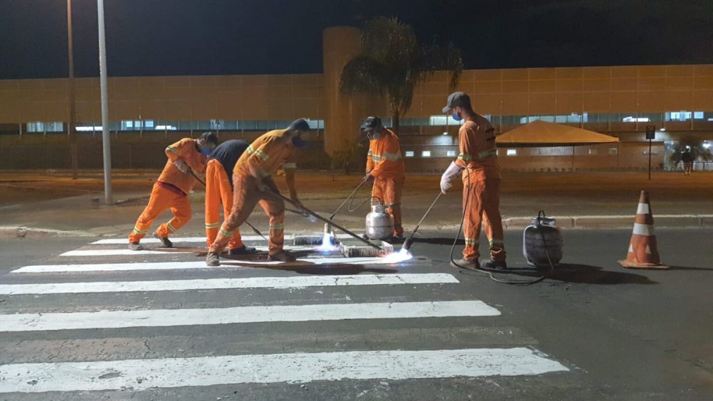 De domingo a domingo, equipes da Diretoria de Engenharia de Trânsito do Detran passam a noite espalhadas pelas RAs recuperando estruturas viárias, preparando novas sinalizações nas vias ou pintando novas faixas de pedestres.