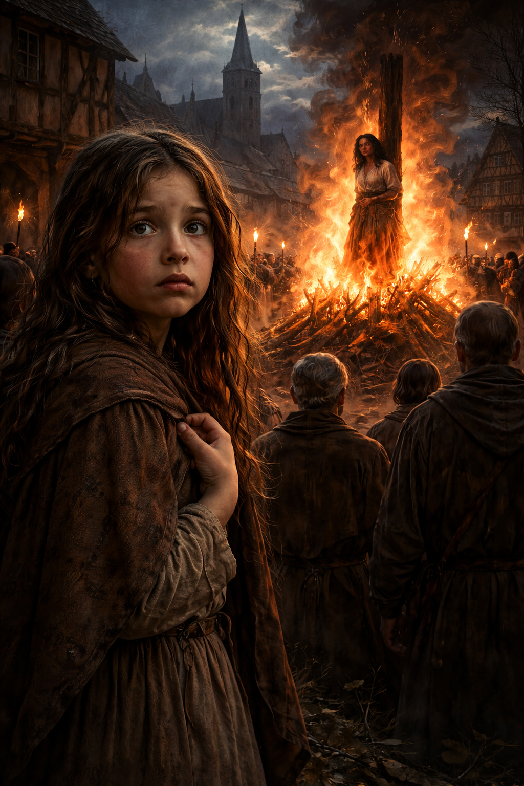 Isabel não rezava. O fogo subiu rápido. A parteira não gritou como a menina imaginava que alguém gritaria. Havia dor, sim — mas também havia uma estranha firmeza. Um olhar que parecia atravessar a multidão como quem procura alguém específico.
