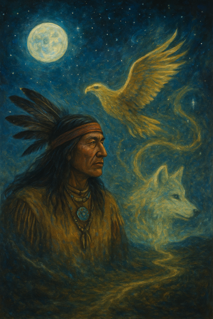 As visões — buscadas através de retiros, jejuns e longas caminhadas solitárias — não são delírios, mas encontros. O animal que aparece numa visão não é apenas símbolo: é mestre, conselheiro, às vezes até parente espiritual. A águia ensina o olhar alto; o coiote, a esperteza; o cavalo, a força silenciosa.