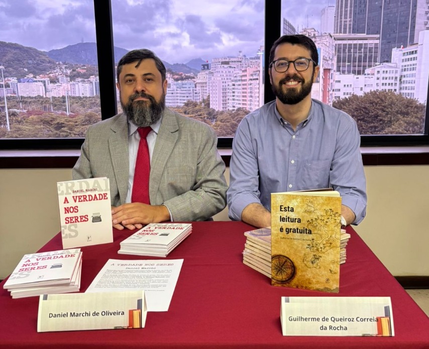Guilherme de Queiroz C. da Rocha, que hoje faz aniversário, é autor de “Esta Leitura é Gratuita”, em livro físico e e-book, pela Editora Patuá. Na foto, Guilherme e eu estávamos na I Mostra Literária da OAB-RJ. Amanhã tem poesia inédita dele aqui no Café Literário.