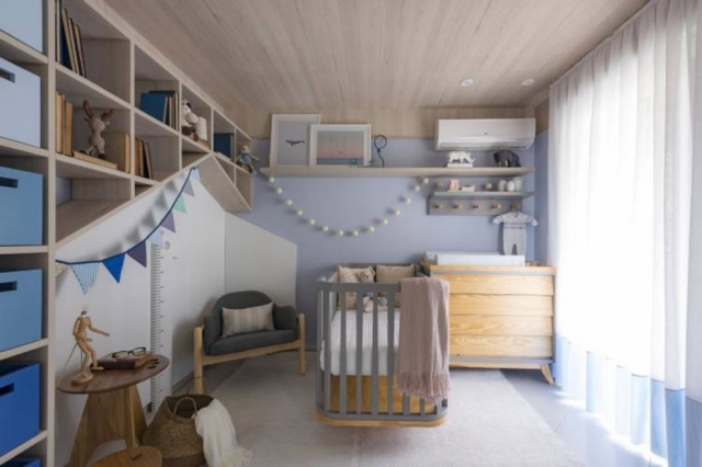 Segundo a arquiteta, no caso, os detalhes decorativos ficaram em segundo plano para complementar o espaço com descontração. “O degradê dos nichos da estante dão vida, mas sem exagero. Eles são e serão muito importantes. Criança ganha muito presente. Precisa ter espaço para guardar tudo isso além dos itens de uso diário e os quartos geralmente são pequenos. É preciso calcular milimetricamente o espaço”, diz.