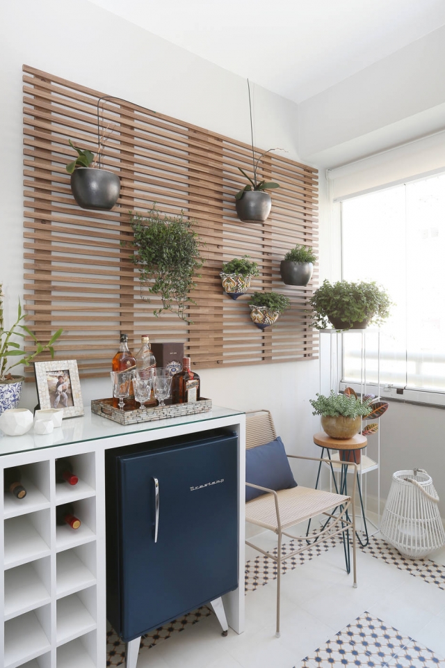Devido à planta estreita, o primeiro passo foi cuidar da varanda original. Embora tenha sido integrada à sala, o que deu maior amplitude ao espaço, os moradores pediram que ela não fosse descaracterizada. “Instalei ladrilhos hidráulicos na área externa para criar contraste com o piso laminado dos outros ambientes”, explica. Para acompanhar, uma treliça de madeira, fixada em uma das paredes, que serve de suporte de para vasos de plantas. “Fica no único lugar onde bate sol. Além disso, complementa a ideia de uma decoração mais despojada”, afirma Livia.