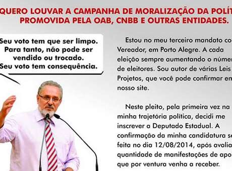 Um candidato a deputado estadual no Rio Grande do Sul decidiu inovar e anunciou que só concorrerá em 5 de outubro se receber o apoio dos eleitores. Vereador de Porto Alegre em terceiro mandato, Bernardino Vendruscolo, do Partido Republicano da Ordem Social (Pros), registrou a sua candidatura na disputa por uma vaga na Assembleia Legislativa, mas condicionou a efetiva participação às manifestações de apoio que receber. Ele inclusive fixou um prazo para a definição: a próxima terça-feira, dia 12 de agosto.