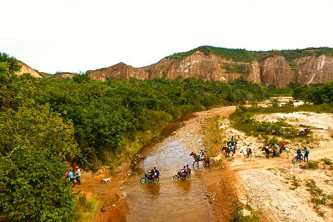 É ele quem sugere visitar a comunidade de Buraquinhos, onde moram seus pais e irmãos. “Vocês vão encontrar uma folia. A gente brinca lá. Meu pai é o alferes, um dos comandantes. Sou filho de João Grilo.” O nome do povoado, um reduto de descendentes de escravos, faz referência a buracos cavados no bico por araras vermelhas, para fazer ninho nos paredões de arenito que cercam a comunidade.
