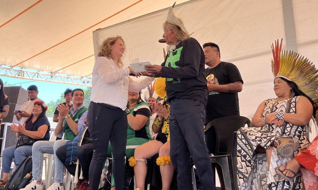 Liderança indígena brasileira reconhecida no Brasil e no exterior, o cacique Raoni Metuktire recebeu uma carta do rei britânico Charles III, que honra o líder kayapó como “impressionante exemplo” a ser seguido. A entrega aconteceu no evento O Chamado do Cacique Raoni – Grande Encontro das Lideranças Guardiãs da Mãe Terra, na Aldeia Piaraçu, no Território Kayapó, em São José do Xingu. O documento chegou às mãos do cacique por meio da Encarregada de Negócios da Embaixada do Reino Unido no Brasil, Melanie Hopkins.