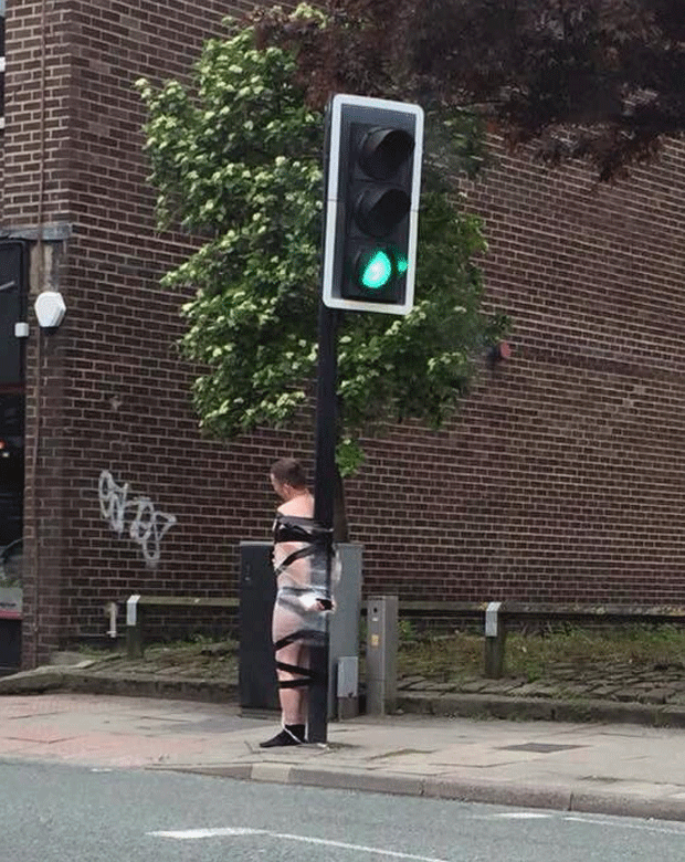Em uma brincadeira após bebedeira, um homem foi amarrado apenas de cueca e meias em um semáforo de Hazel Grove, subúrbio de Stockport, na Inglaterra.