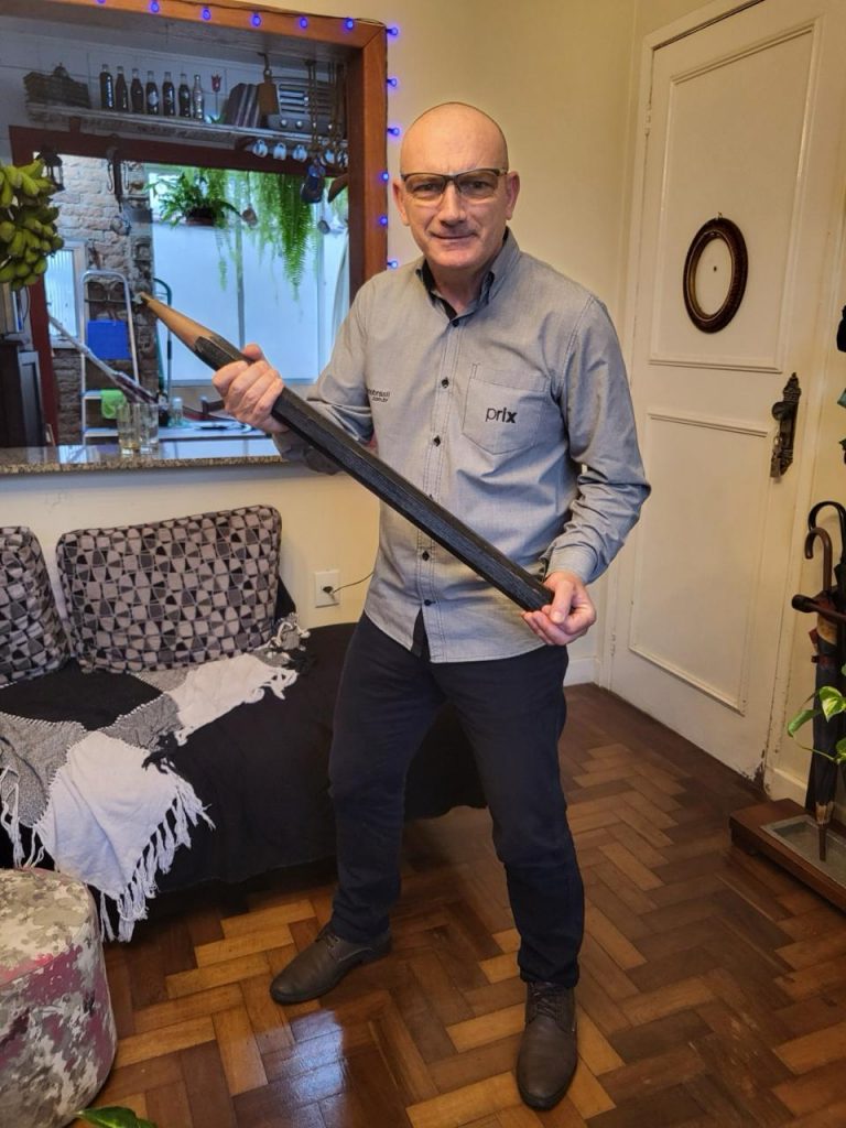 Por sua vez, o Raul, que tem físico mais para maratonista do que para lutador dessas lutas em gaiolas, correu que nem um doido para ver o que estava acontecendo. Assim que ele teve a exata noção do que poderia acontecer com o seu rebento, não teve dúvida. Pegou o que tinha mais perto e desceu as escadas como um verdadeiro Usain Bolt.