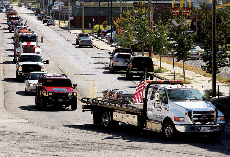 O americano Richard “Dick” Klaffer, dono de uma companhia de reboques em Alton, no estado americano de Illinois, teve um cortejo fúnebre de acordo com sua profissão.
