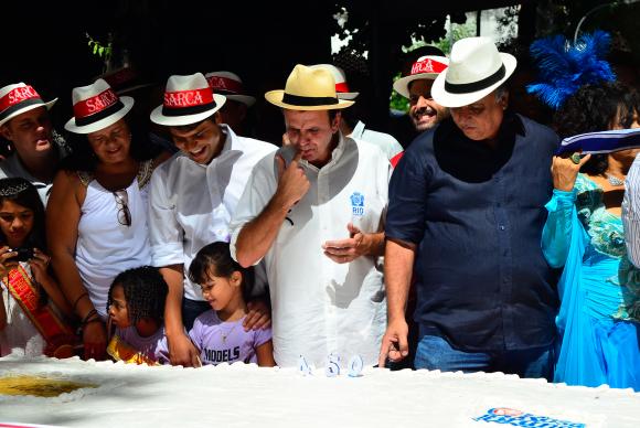 Eduardo Paes deu a primeira fatia do bolo ao governador do estado, Luiz Fernando Pezão, que retribuiu entregando a segunda ao chefe do Executivo municipal. O arcebispo Dom Orani Tempesta também participou da festa. Ele levou a imagem peregrina de São Sebastião, padroeiro da cidade.