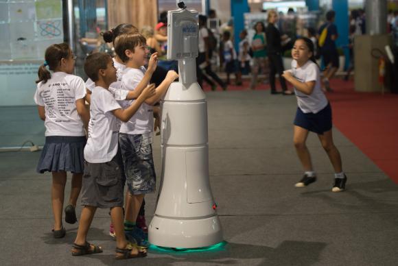 Robô atrai atenção de crianças em feira de ciência e tecnologia