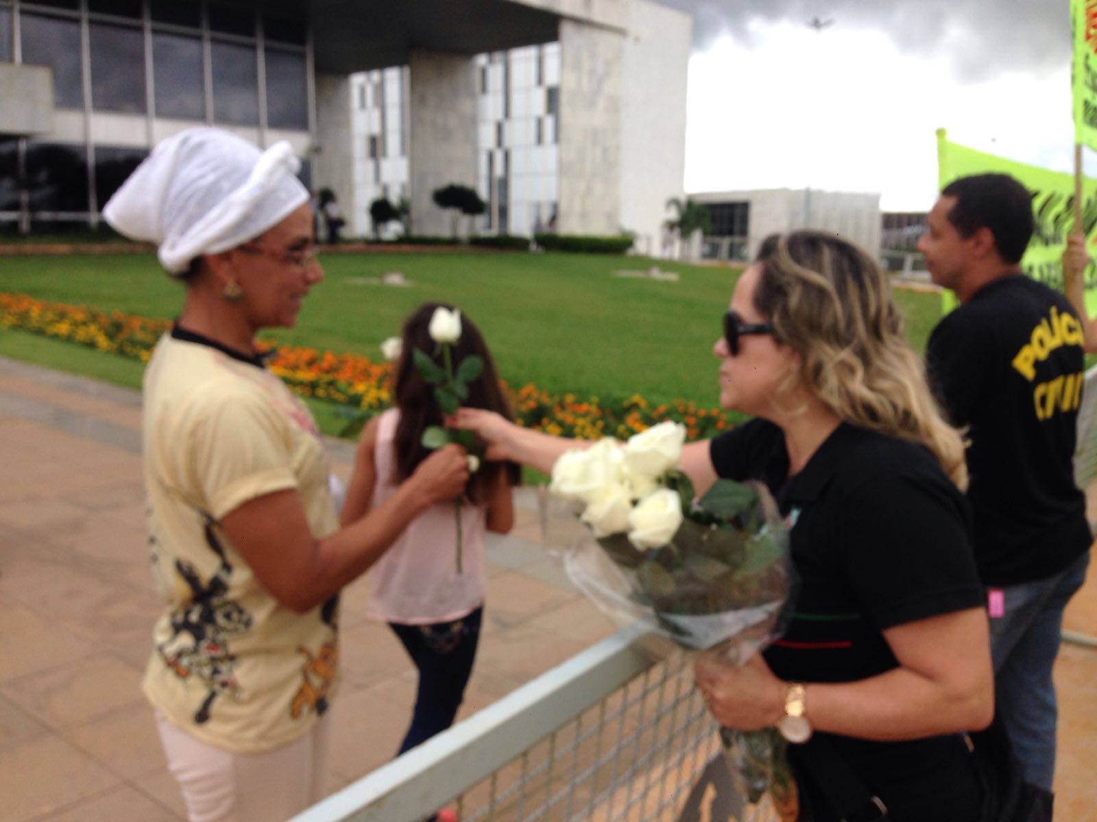 Polícia é – e quer – paz. Essa foi a tônica da campanha do Sinpol-DF, na quinta-feira, 21, durante manifestação dos policiais civis defronte ao Palácio do Buriti. Enquanto lá dentro, no Salão Nobre, o governador Rodrigo Rollemberg se preparava para receber um grupo de representantes dos cultos afro-brasileiros, para anunciar a criação da Delegacia de Combate aos Crimes Raciais, do lado de fora, em meio à chuva, policiais presenteavam quem chegava com rosas brancas. Simbolismo à parte, o gesto foi enaltecido por quem presenciou a cena.