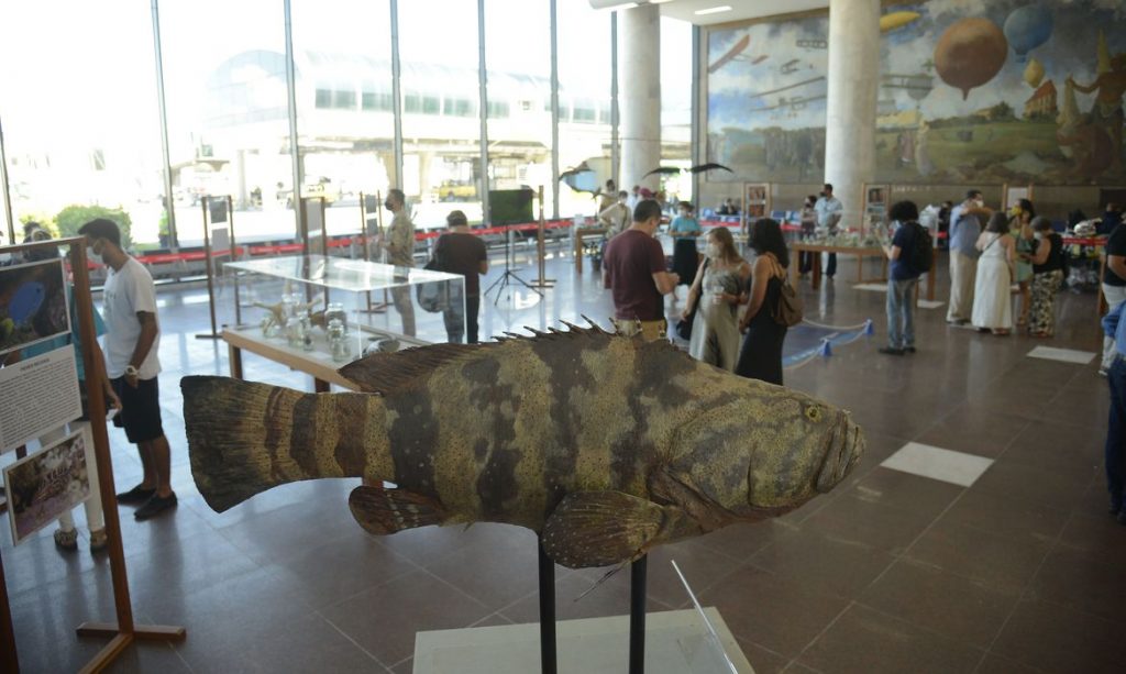 Os destaques são os exemplares taxidermizados, popularmente chamados de “empalhados”, como as aves marinhas atobá-marrom e fragata e o peixe mero com mais de um metro de comprimento. A mostra traz ainda artefatos arqueológicos como machados de pedra polida e cerâmicas, que registram a presença indígena tupi-guarani no local desde o século 15.