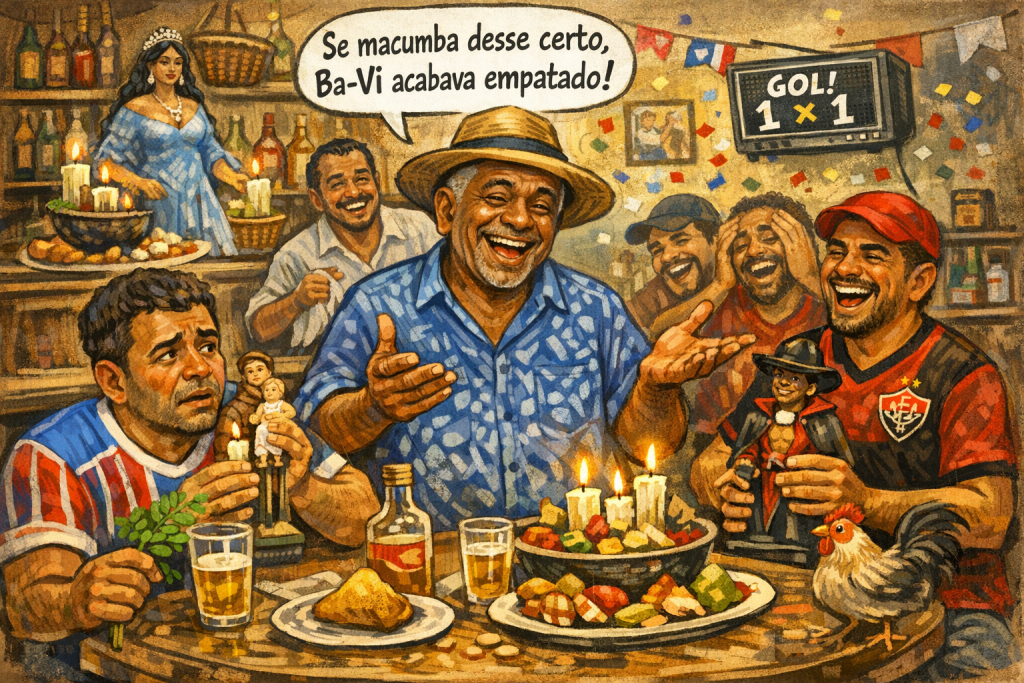 — Pense comigo. Bahia e Vitória jogam, né? Um perde, o outro ganha. Aí começa a romaria. Um vai no terreiro de Mãe Rita, outro vai acender vela pra Santo Antônio, outro passa no despacho da esquina, outro toma banho de sal grosso com folha de arruda e pensamento positivo.