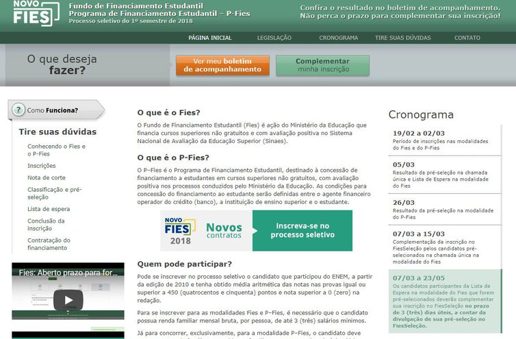 Os estudantes pré-selecionados para o Fundo de Financiamento Estudantil (Fies), do primeiro semestre de 2018, têm desta segunda (30) até sexta-feira (3) para fazer a complementação da inscrição. O processo deve ser feito por meio do acesso à página do Fies na internet